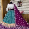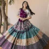 Paired with substantial traditional jewelry—including gold bangles, statement necklaces, and earrings—the lehenga exudes festivity and opulence. The outfit is perfect for grand occasions like weddings, Navratri Garba, or family celebrations, where making an unforgettable entrance is a priority. Beyond its surface beauty, the handwork speaks of generational skills passed down through artisans, capturing the core of India’s textile legacy.