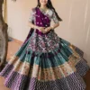 This regal lehenga evokes the grandeur of traditional Indian artistry, featuring a captivating deep purple base adorned with intricate mirror work and elaborate embroidery. The skirt is a masterpiece of textile craftsmanship—fine mirror embellishments catch the light, creating a luminous effect against the rich purple tone, while motifs in green, pink, and white form dazzling patterns throughout. Each embroidered motif tells a story, blending floral geometry with a rhythmic interplay of colors that mimic the essence of a festive celebration.